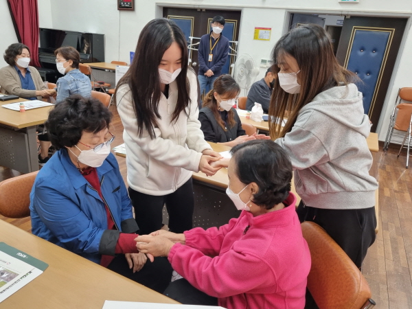 교육에 참여한 지역주민은 “그동안 코로나 감염 우려로 신체접촉이 뜸했는데 철저한 손씻기 후 손마사지가 진행돼 안심되고, 학생들의 따뜻한 마음이 손을 통해 전달돼 오늘 몸과 마음이 더 건강해진 것 같다”고 감사의 마음을 전했다.