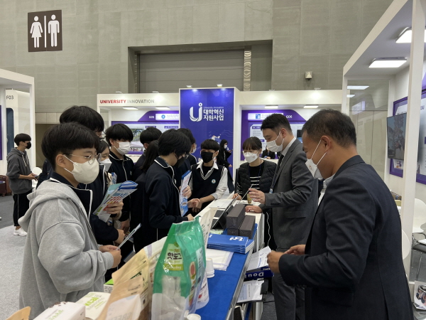 산학협력 EXPO에 방문한 관객들에게 대학 ESG 성과를 홍보하는 건양대 대학혁신지원사업단 관계자 1.jpg