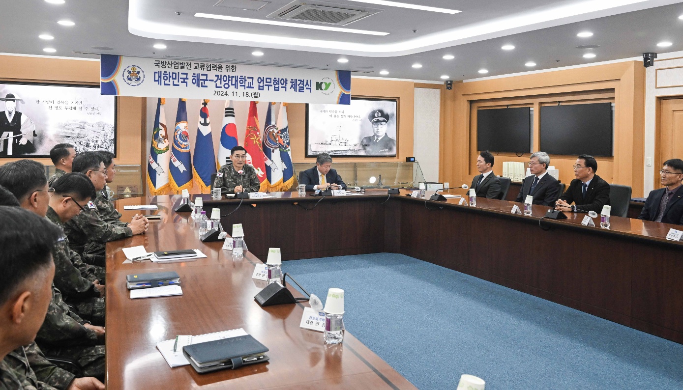 건양대와 해군본부는 18일 충남 계룡시 계룡대에 위치한 해군본부에서 양 기관 상호 교류 및 발전방향 모색 및 국방산업 발전을 협력하는 내용의 업무협약을 체결했다. 협약식 모습.jpg